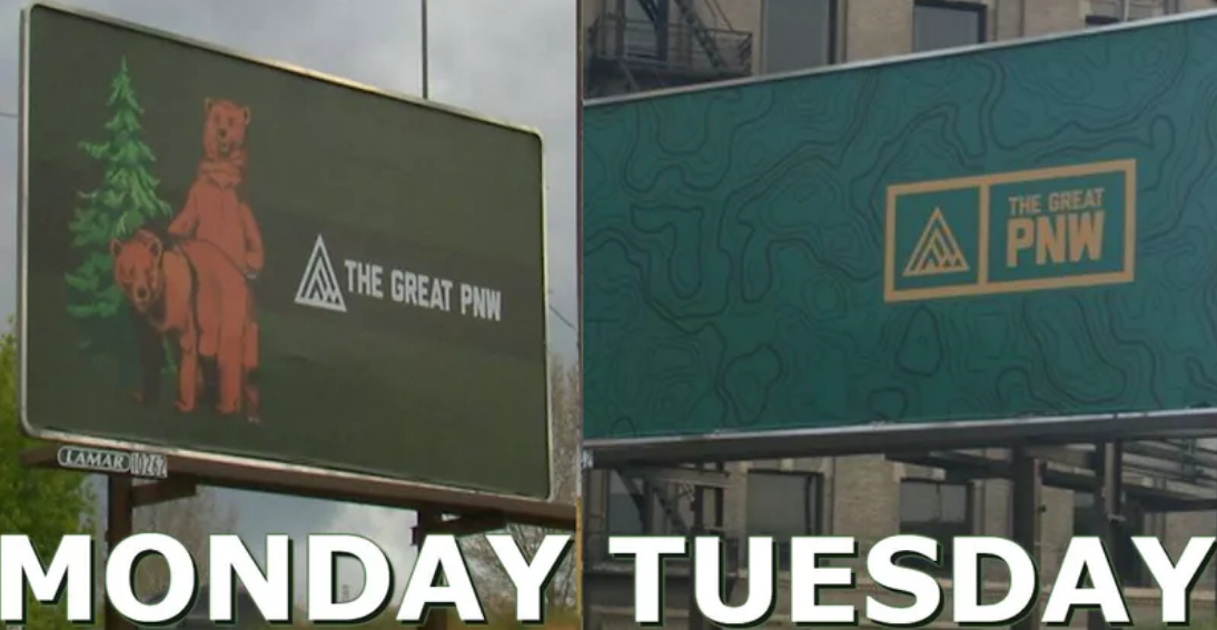 SPOKANE, Wash. - 8 hours. 8 hours is all a billboard featuring two bears lasted in downtown Spokane on Monday before it was taken down. The ad from The Great PNW featuring two grizzly bears certainly caught the attention of passing motorists due to their positioning. Some people simply saw bears, other saw the bears in a racy act.